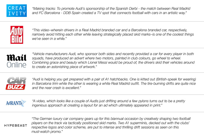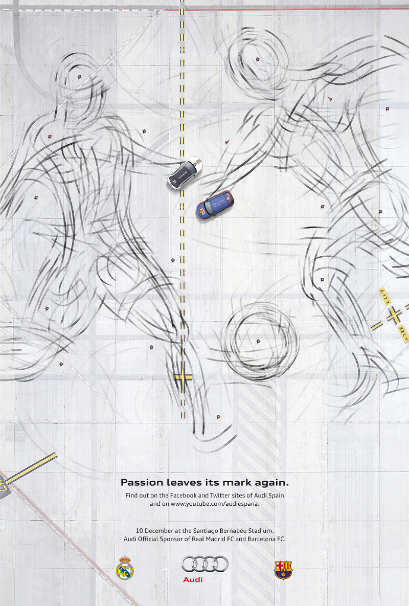 On December 10th, the Spanish Derbi a.k.a. "El Clásico" took place at the Santiago Bernabéu Stadium, the long awaited match between Real Madrid CF and FC Barcelona. As a sponsor and official vehicle supplier of both teams, Audi wanted to be present this year in a very special way with an action connecting both online and offline environments: a print ad in major newspapers all over Spain produced as never before and an online video and a TV spot showing both football and car fans how they did it. Two passions, two players and a challenge...