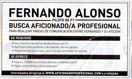 An employment offer -“Fernando Alonso seeks Professional Fan to carry out communications tasks between Fernando and his fans”- advertised just in Spanish newspaper employment sections and on national internet portals for employment.