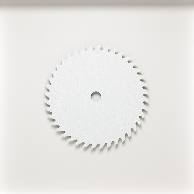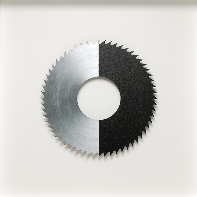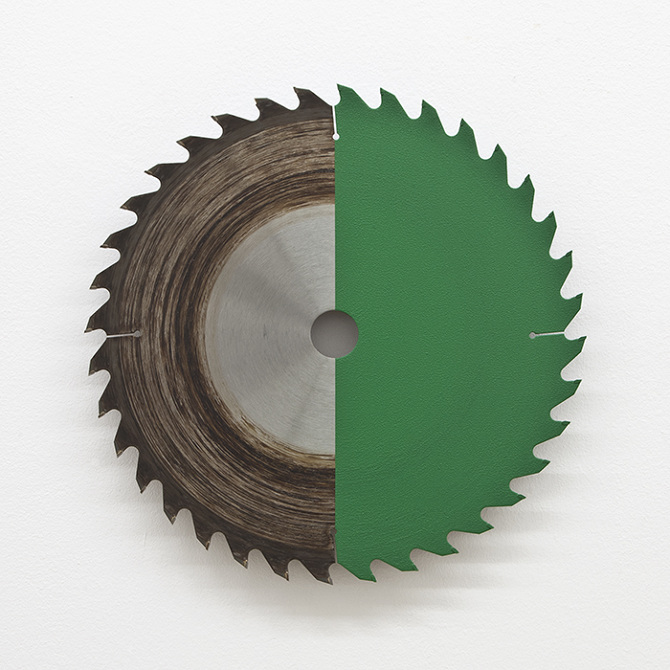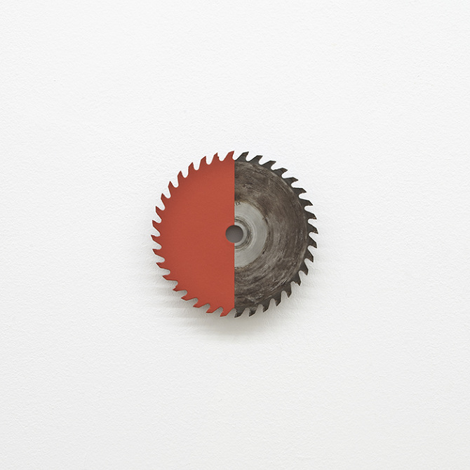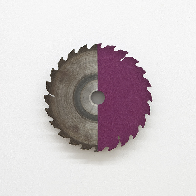acrylic on circular saw blade, wood