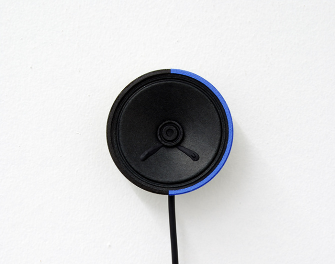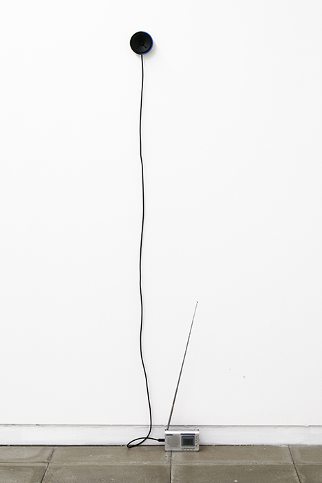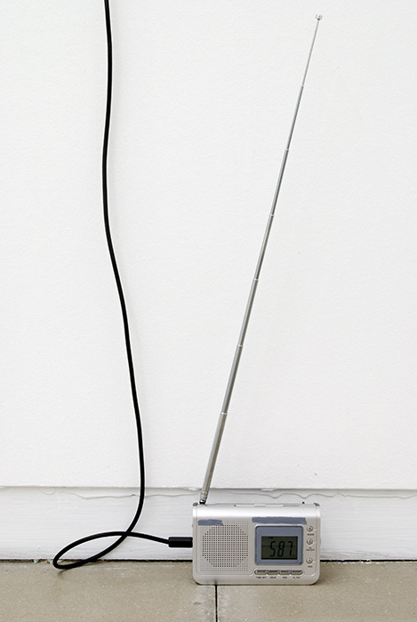 audio: permanent (random), the radio is tuned in AM 587 KHz frequency, the audio depends on whatever sound the radio pick’s up from this tuning in the exhibition place, the blue from the painting is in 587 Hz of the color spectrum