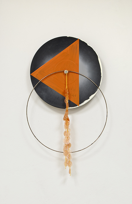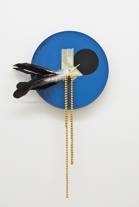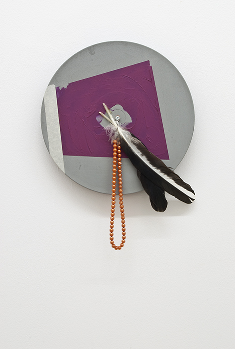 primer, acrylic, tape, necklace, feathers on vinyl record, aluminium structure