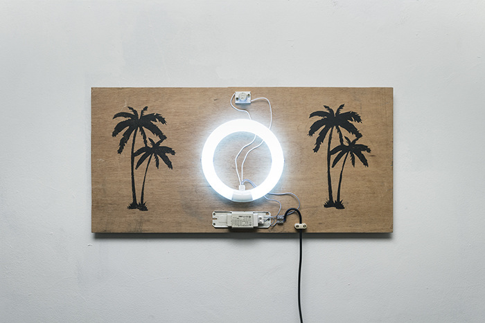 acrylic and fluorescent light on wood, electrical cable