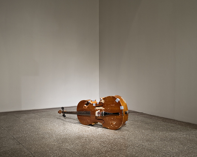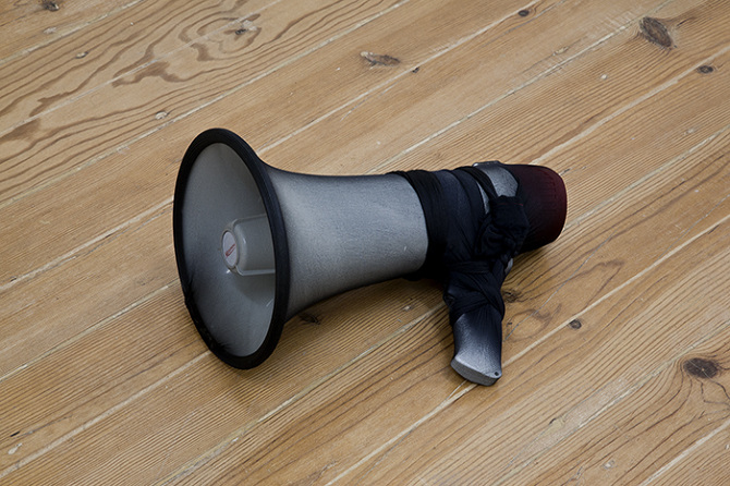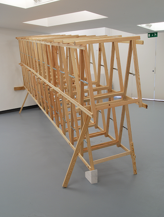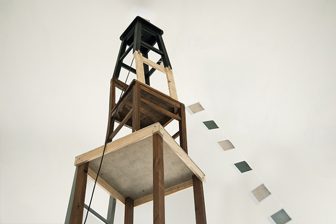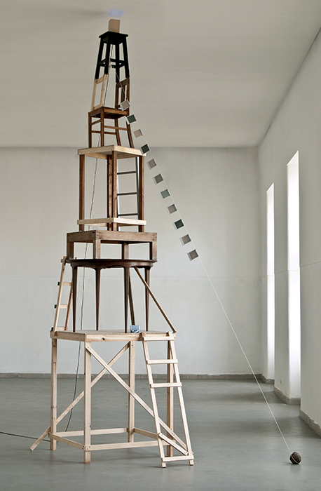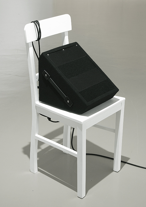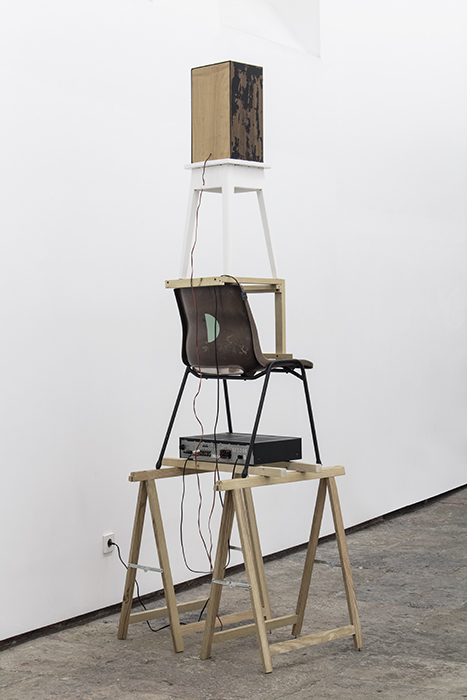 wood, trestles, acrylic on chair, enamel on stool, speaker, amplifier, mp3 player, audio cables