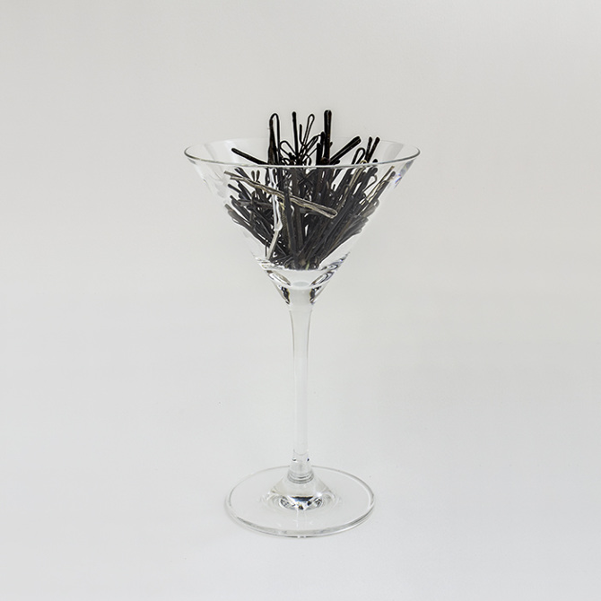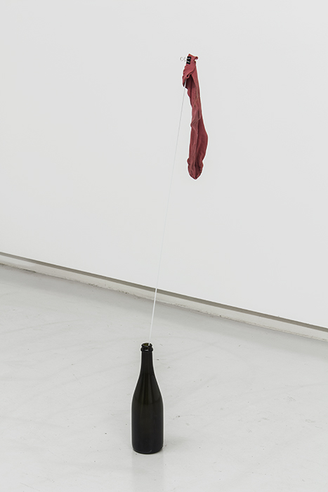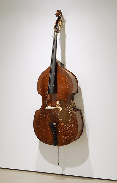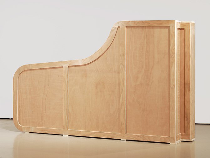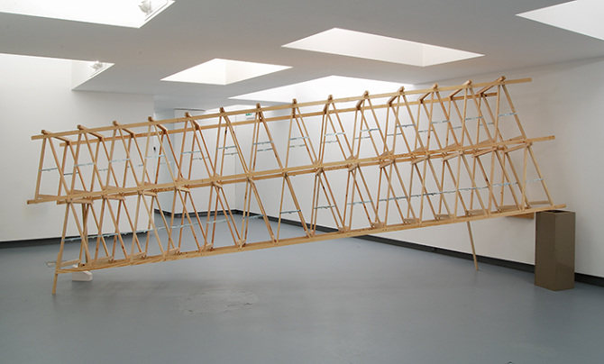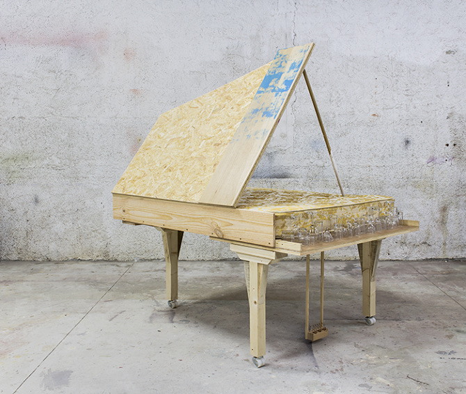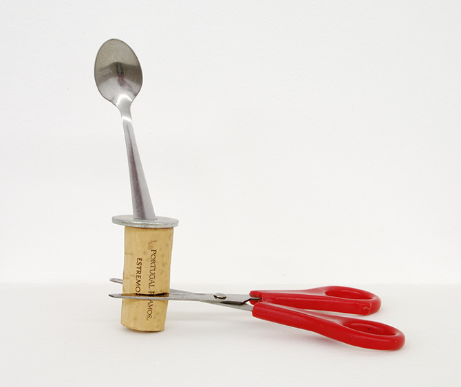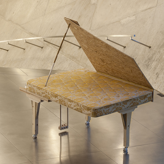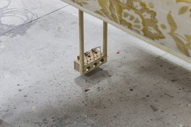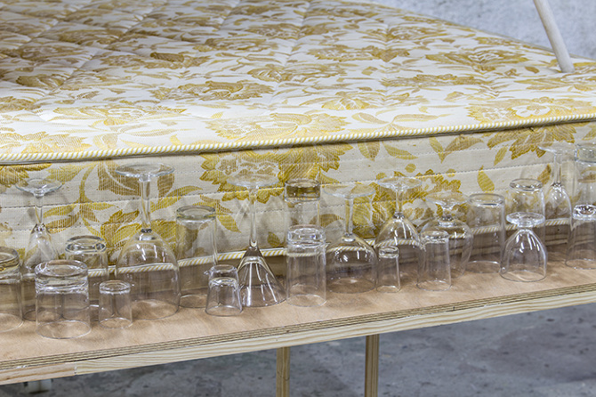 wood, enamel on wood, wall paint on broomstick, mattress, drinking glasses, mousetrap, caster wheels, brass piano hinges