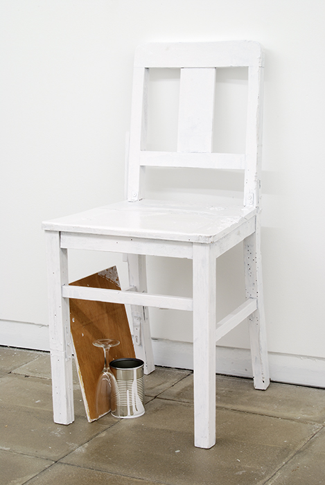 Enamel, acrylic and ironmongery on chair, wood, glass, can