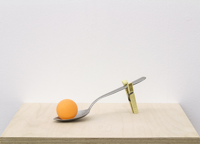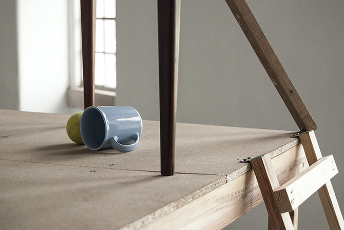 furniture, wood, iron, stone, tennis ball, cup, Polaroids, polyester string, clips, lamp, electrical cable, electrical hardware