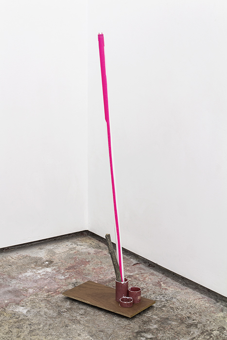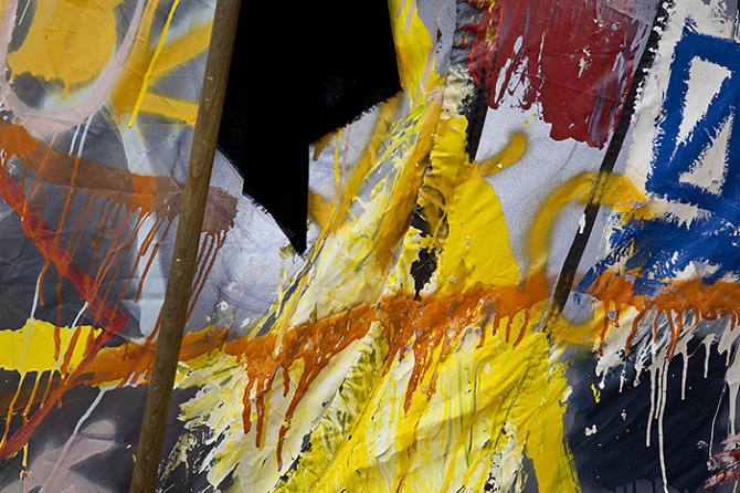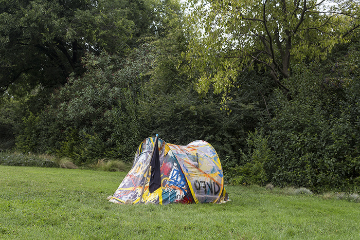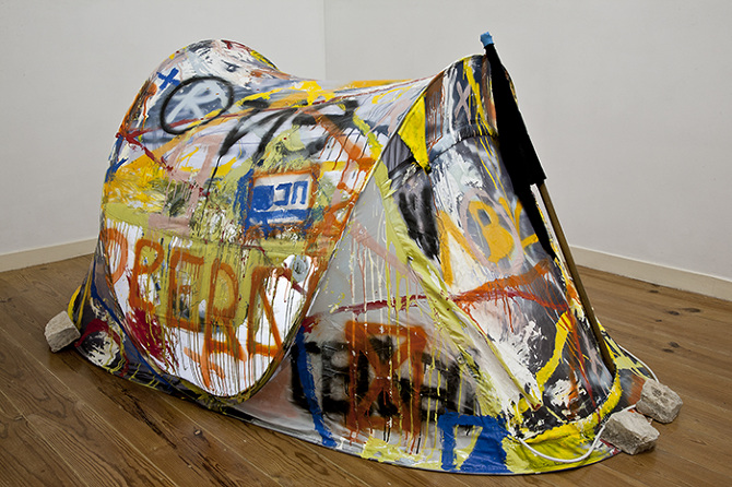 enamel and acrylic on tent, wood, fabric, stones, fluorescent light, electrical cable