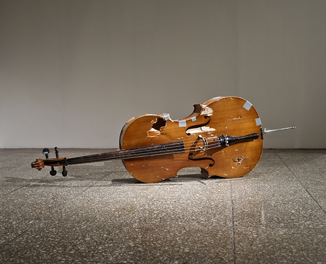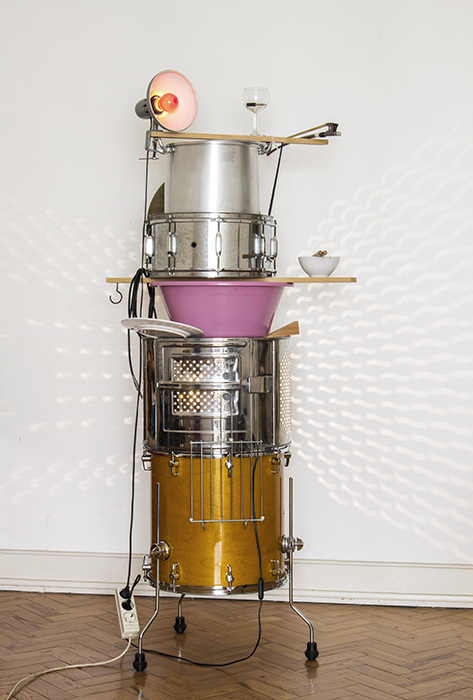 wood, floor tom, washing machine drum, plastic basin, snare drum, cooking pot, lamp, red bulb, triple extension socket, grill rack, cable ties, lamp socket, electrical cable, plug, switch, white bulb, plate, audio cable, iron hook, bowl, drumsticks, cymbal, washer, acrylic chopstick, wine glass, Jack plug, contrabass bow, cable ties