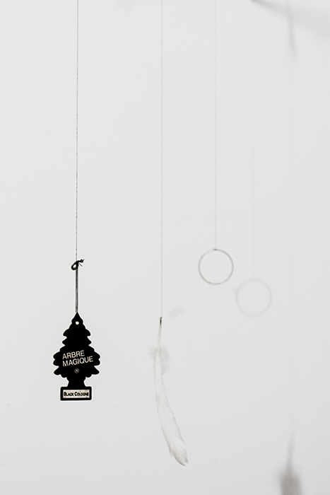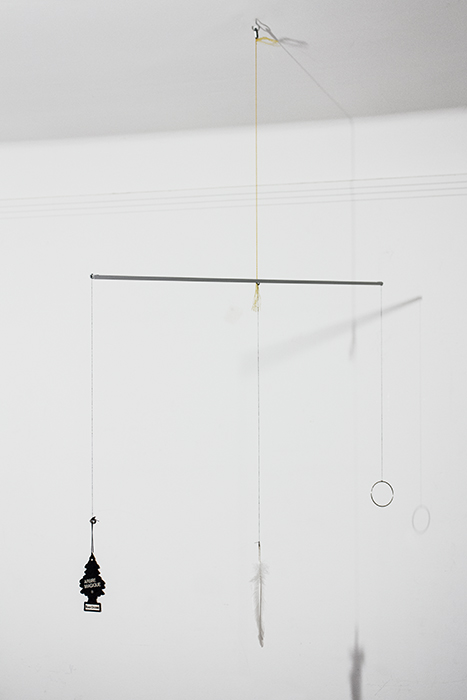 metal nut, cotton string, aluminium, metal ring, feather, Arbre Magic freshener, cotton thread, washers