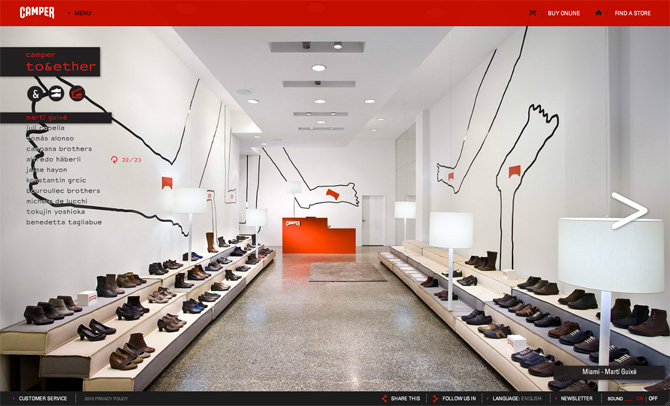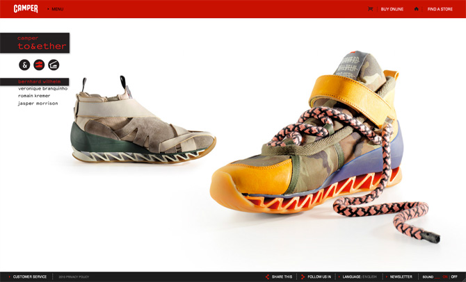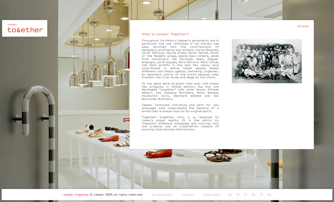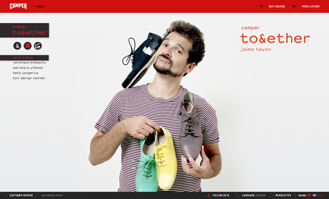Background: Microsites for Camper's premium label of store and product designer collaborations, Camper Together. Artists like Jaime Hayon, Alfredo Haberli, Campana Brothers or Tokujin Yoshioka are part of this project.