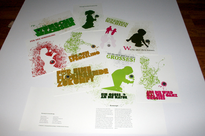 Postcard competition with Marcel Kläber. The cards contained motivational slogans about growth with flower seed capsules. Mine have the fatty type. We just missed the final selection and something with the same concept as the year before won. I heard that this year, something using the same concept that we had made it to the finals. /// Marcel Kläber und ich haben Postkarten mit motivierenden Sprüchen über Wachstum inklusive Blumensamen bei einem Grußkartenwettbewerb eingereicht. Meine sind die mit den fetten Buchstaben. Wir haben knapp die engere Auswahl verfehlt und es hat irgendwas gewonnen, was das gleiche Konzept wie das Jahr zuvor verfolgt hatte. Ich habe gehört, dass dieses Jahr das gleiche Konzept wie unsere es weitergeschafft hat.