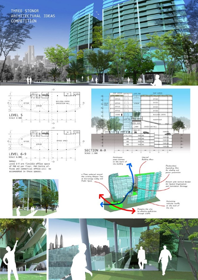 The object of the competition is to find innovative, environmentally sustainable and economically viable solutions to the development of PAM Education Fund's property on No. 3, Jalan Stonor, Kuala Lumpur, Malaysia. The competition brief calls for an ArchiCentre, a combination of exhibition spaces, auditorium, galleries, commercial, and office spaces as well as PAM’s own office. The design shall achieve Green Building Index (Gold) or better.