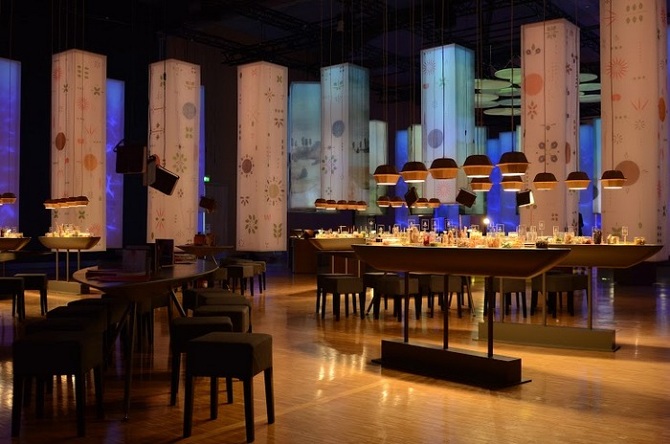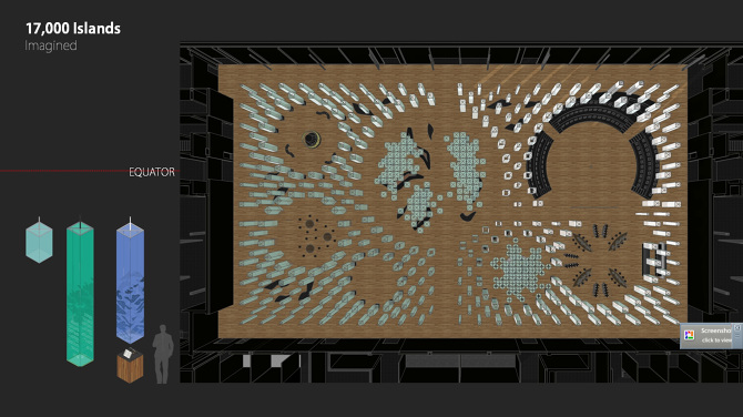 The theme, 17,000 Islands of Imagination, presents an ambiance and images suggestive of an archipelagic world, Indonesia, a country linked by seas, shaped by a chain of volcanic histories, mold by a narrative of nationhood. The design of the pavilion uses rows of lanterns in colors of the seas hung from the ceiling to define spaces and represent the image of the Indonesian archipelago.