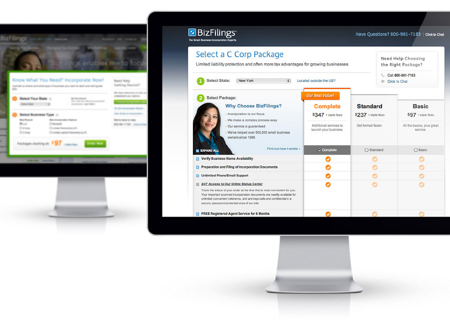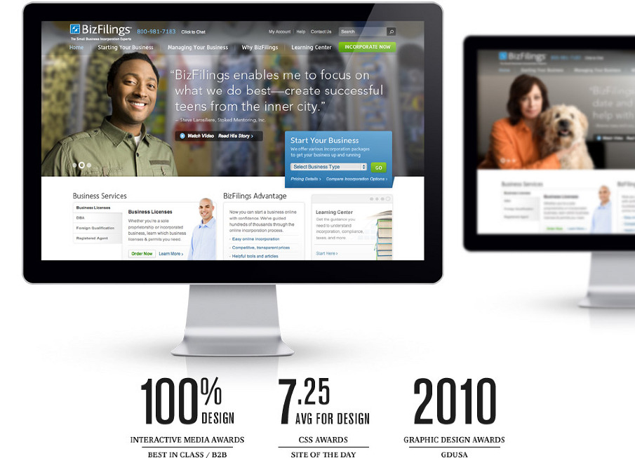 We tackled this by redesigning the site and brand to become more people focused rather than product. By using existing and satisfied customers as the face of BizFilings, we were able to transform the site from a standard product driven site to a brand that really cares about their customer.