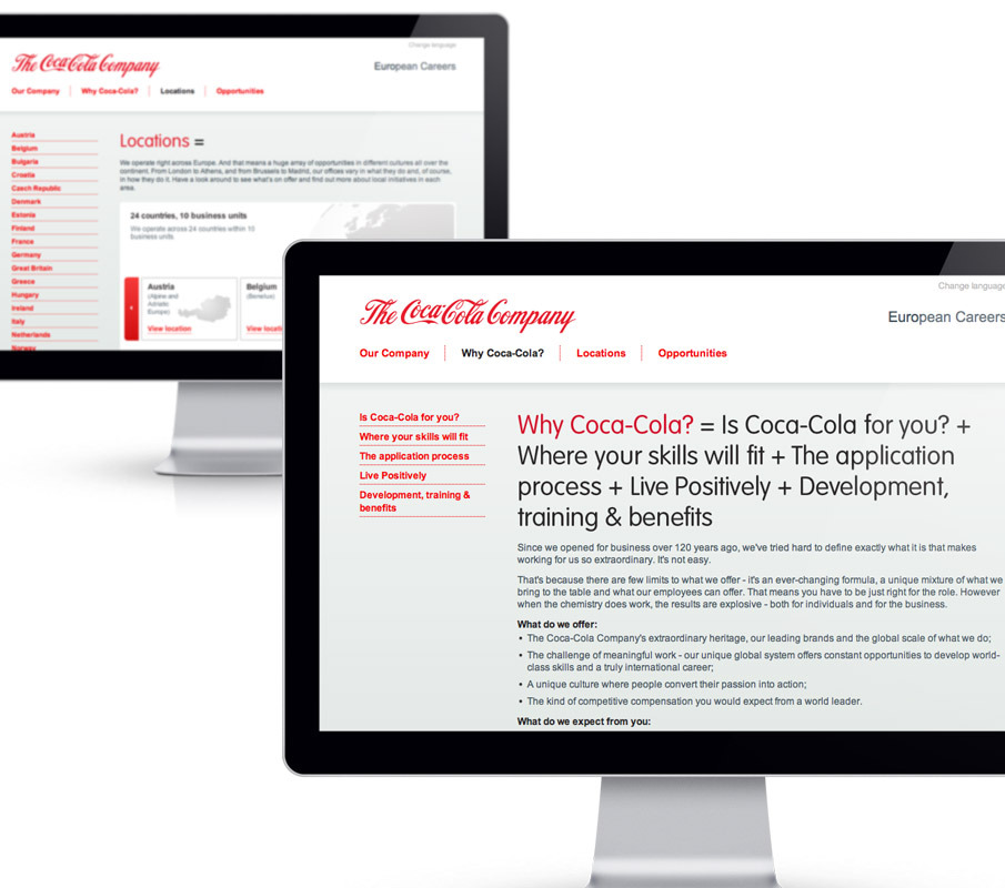 The task was difficult. We were asked to design a site that persuaded people that a job at Coca-Cola Europe is more than just a job, it is a career filled with great possibilities. We came up with a solution that allowed users to navigate through different interactive video testimonies, allowing the user to understand what it is like to work for Coca-Cola.