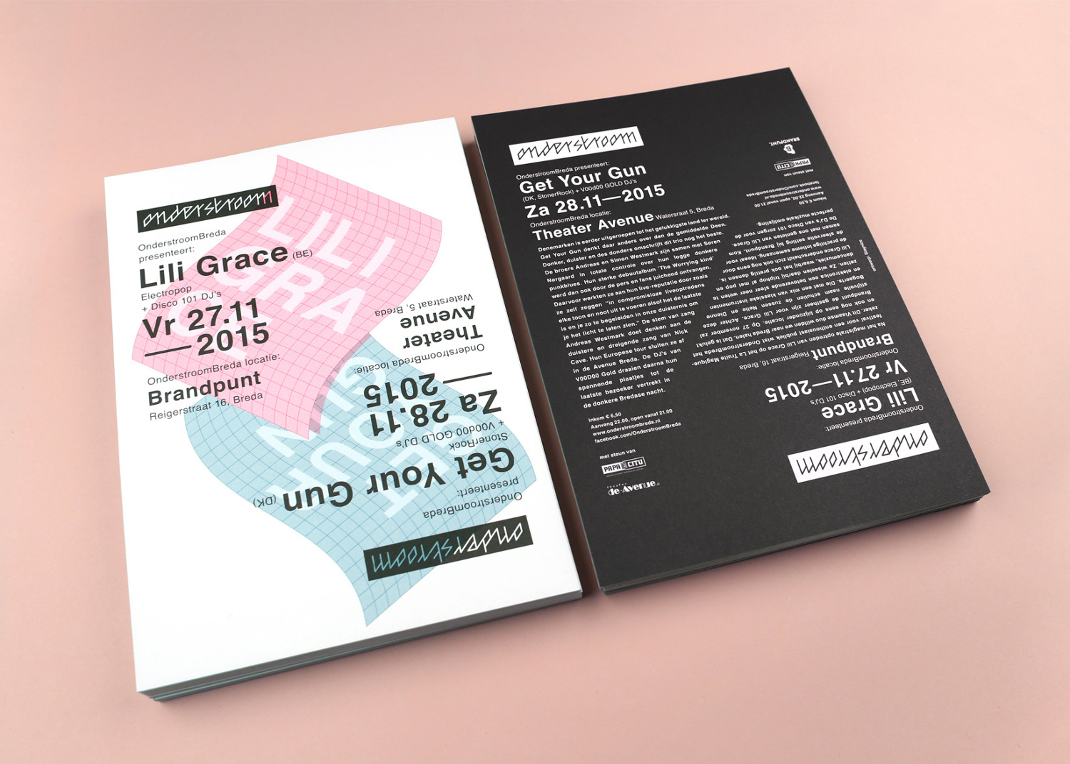 12 – Flyer ontwerp (onderdeel van de visuele identiteit) voor Onderstroom, een club enthousiastelingen met een muziekhart die super toffe concertavonden organiseren. Flyer design for concert nights.