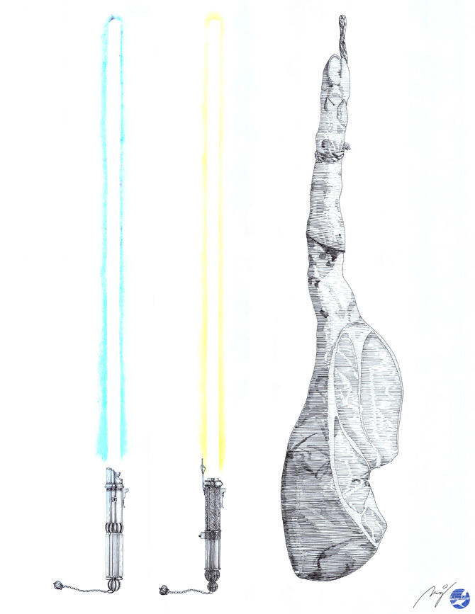 In “Koshering Meat” in continuation with a series titled “Jewdi” which includes the work “Yadsaber” comes together a pair of “lightsabers” detailed with exquisite judaica ornaments sided with a full “Jamón Ibérico” (dry-cured ham from Spain) that traditionally needs to be thinly sliced therefore classically is cut with a long and super-sharp knife. This juxtaposition creates the most trivial religious paradox around the Jewish faith restrictions on the consumption of pork.