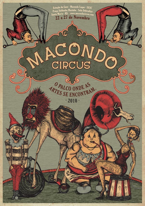 Ilustrações e Identidade Visual para o festival de cultura Macondo Circus 2010. Ilustrações realizadas por Luisa Hervé, Jéssica Albuquerque e Vivian Dall Alba.